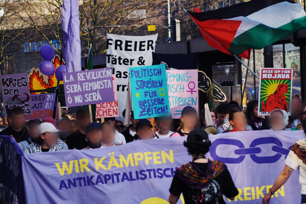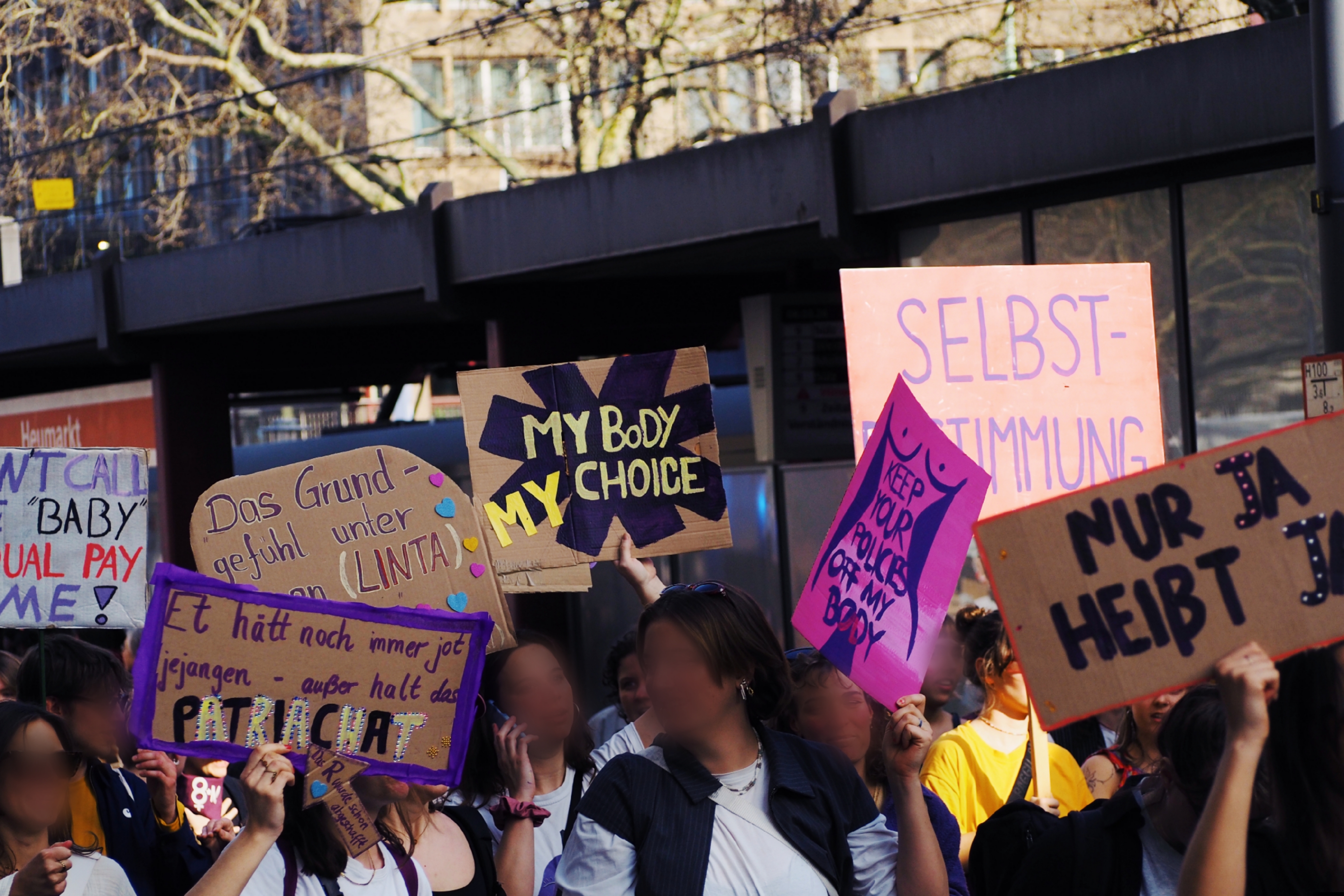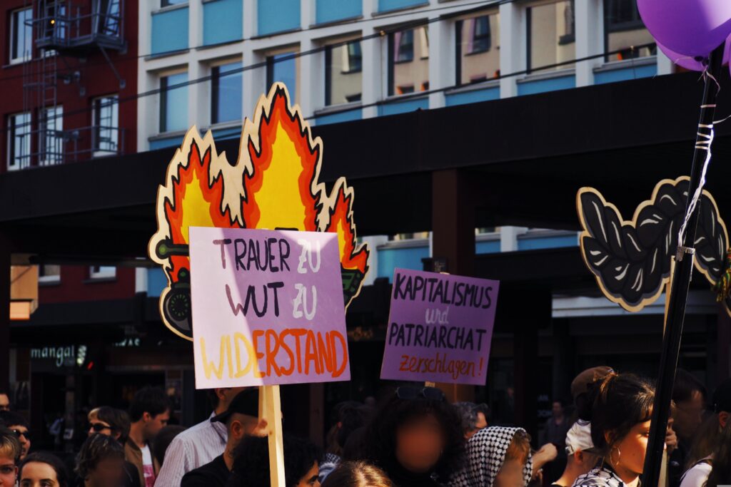 Ich schaue mich auf dem Platz um und fange an die Sprüche auf den vielen selbst gemalten, bunten Plakaten zu lesen, von denen die meisten einen bitteren Nachgeschmack haben. Sie thematisieren Diskriminierung und Gewalt, die Verschränkung von Klimakrise, Kapitalismus und Patriarchat und der Forderung nach Selbstbestimmung über den Körper und gerechten Arbeits- und Lohnverhältnissen. Es fühlt sich im ersten Moment empowernd an die Plakate zu lesen und die Gesichter der Menschen zu sehen, die auf die Straße gehen, aber ich bin gleichzeitig auch enttäuscht als mir auffällt, wie wenig Männer da sind, um die feministische Demonstration zu unterstützen.